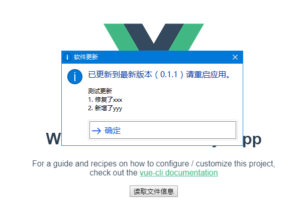 可以看到程序启动后,弹出了新版本的更新内容,这里点击确定执行更新,更新成功后会自动重启应用。