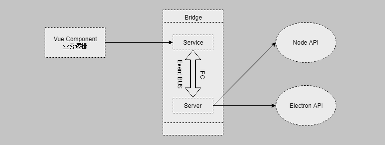 正常来说vue组件应该只关心页面层的逻辑即可,所以为了解耦,可以在Vue Component和Node API、Electron API中间插入一个桥接层,然后通过IPC进行通讯,如下图所示: