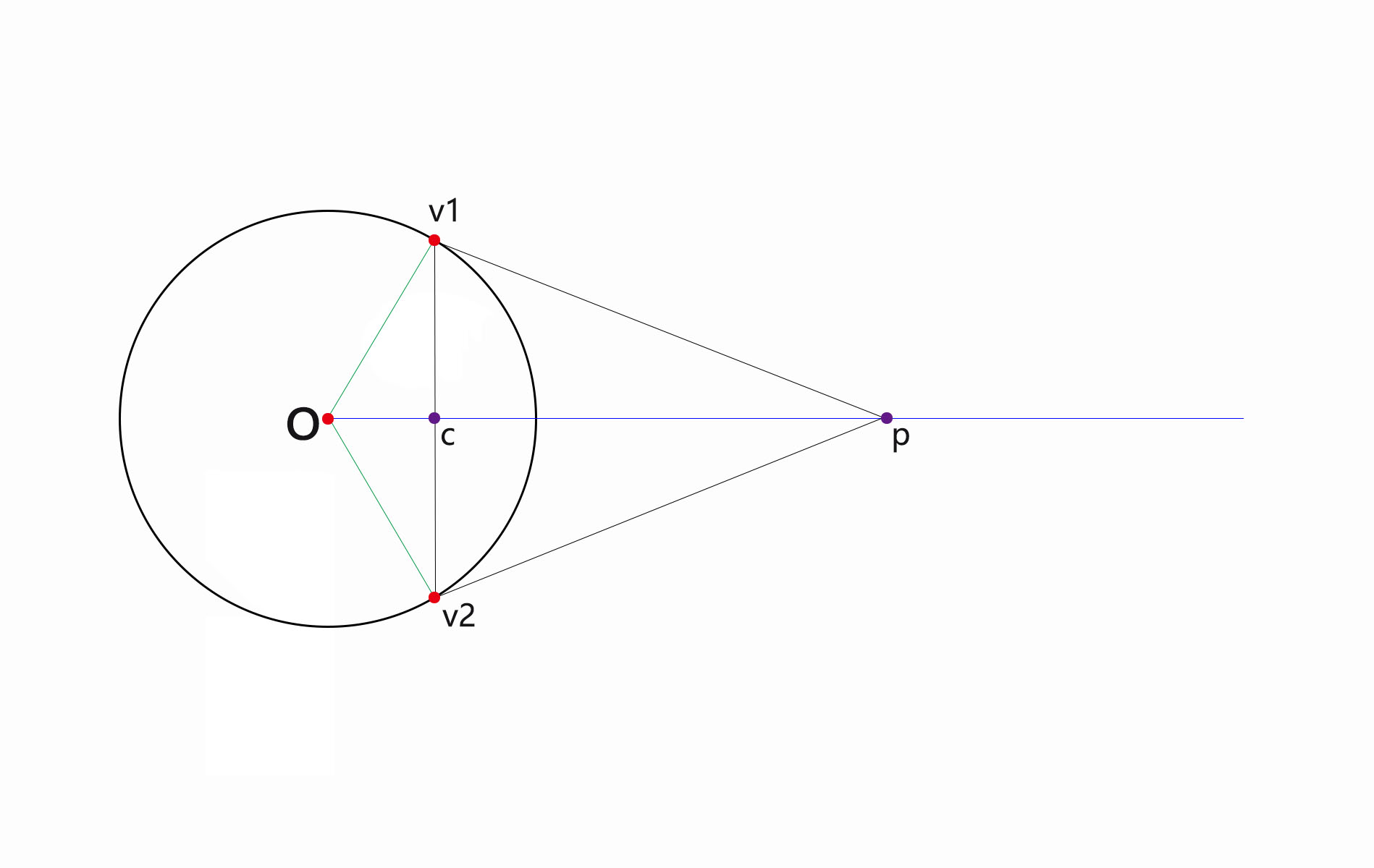 链接v1 v1,取中点c,链接oc,做一条射线,在射线取一点p,链接v1p,v2p,在v1,v2上取两点作为控制点;