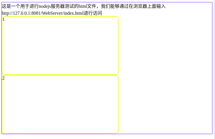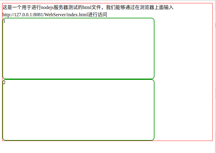<!DOCTYPE html> <html lang="en"> <head> <meta charset="UTF-8"> <title>index</title> <link rel="stylesheet" href="http://127.0.0.1:8081/WebServer/static/index.css" rel="external nofollow" > </head> <body> 这是一个用于进行nodejs服务器测试的html文件,我们能够通过在浏览器上面输入 http://127.0.0.1:8081/WebServer/index.html进行访问 <div>1</div> <div>2</div> </body> </html>