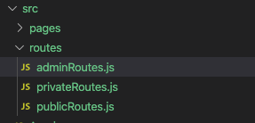 为了好管理这三种页面,我们可以将他们抽取成三个文件,放到一个独立的文件夹 routes 里面,三个文件分别命名为 publicRoutes.js , privateRoutes.js , adminRoutes.js :