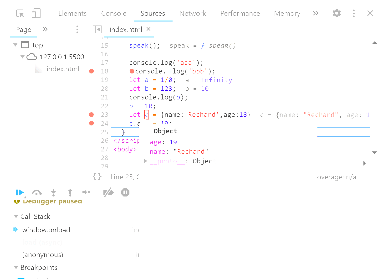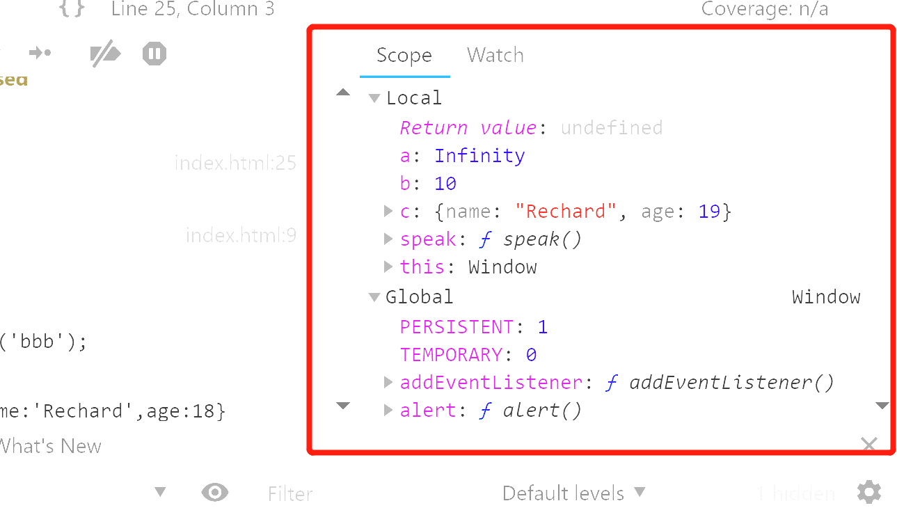 鼠标移到变量上面,就会显示变量的内容,右侧调试面板中的Scope中也可以看到局部变量的内容。