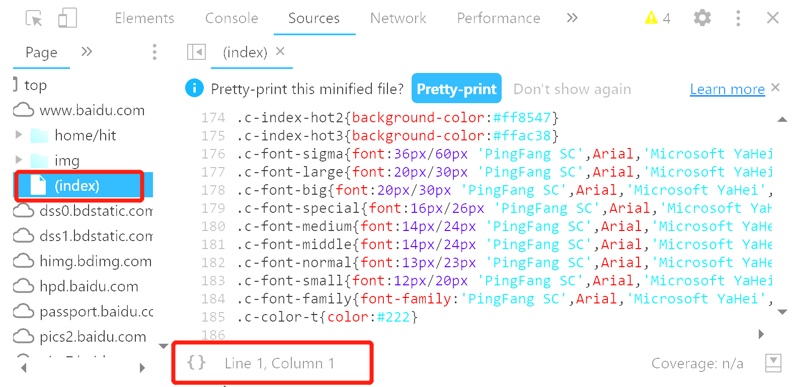 现在很多公司都要求前端代码打包并加密,因此我们看到的代码可能几乎没有可读性可言,此时我们只需要点击下面的格式化按钮,浏览器就会自动帮我们整理好代码的格式,真心大爱Chrome。