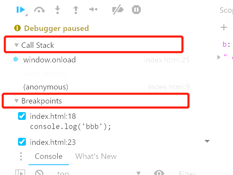 像上面的两个console,第一个打印的是'aaa',第二个打印的是'bbb',此时在第二个console左侧点击一下,就会出现dbug的红点,刷新网页时,运行到第二个console就会停止,也就是只会打印aaa。