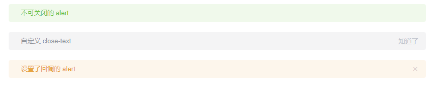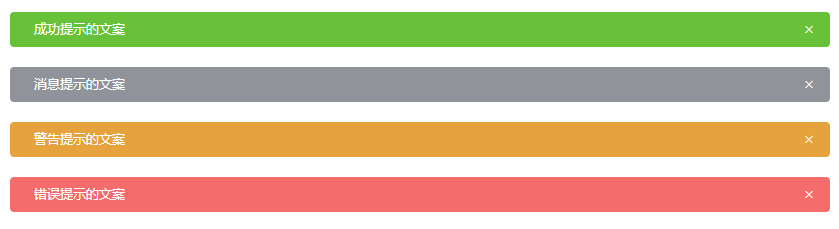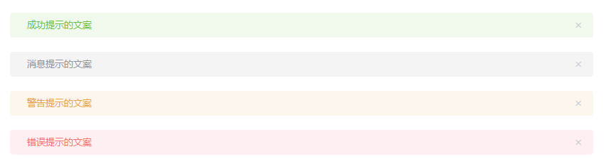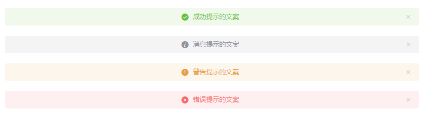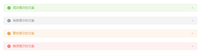 <template> <el-alert title="成功提示的文案" type="success"> </el-alert> <el-alert title="消息提示的文案" type="info"> </el-alert> <el-alert title="警告提示的文案" type="warning"> </el-alert> <el-alert title="错误提示的文案" type="error"> </el-alert> </template>