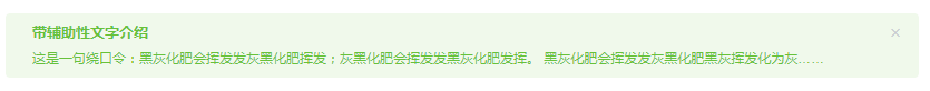 <template> <el-alert title="带辅助性文字介绍" type="success" description="这是一句绕口令:黑灰化肥会挥发发灰黑化肥挥发;灰黑化肥会挥发发黑灰化肥发挥。 黑灰化肥会挥发发灰黑化肥黑灰挥发化为灰……"> </el-alert> </template>