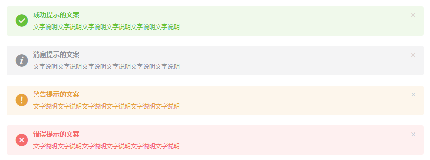 <template> <el-alert title="成功提示的文案" type="success" description="文字说明文字说明文字说明文字说明文字说明文字说明" show-icon> </el-alert> <el-alert title="消息提示的文案" type="info" description="文字说明文字说明文字说明文字说明文字说明文字说明" show-icon> </el-alert> <el-alert title="警告提示的文案" type="warning" description="文字说明文字说明文字说明文字说明文字说明文字说明" show-icon> </el-alert> <el-alert title="错误提示的文案" type="error" description="文字说明文字说明文字说明文字说明文字说明文字说明" show-icon> </el-alert> </template>