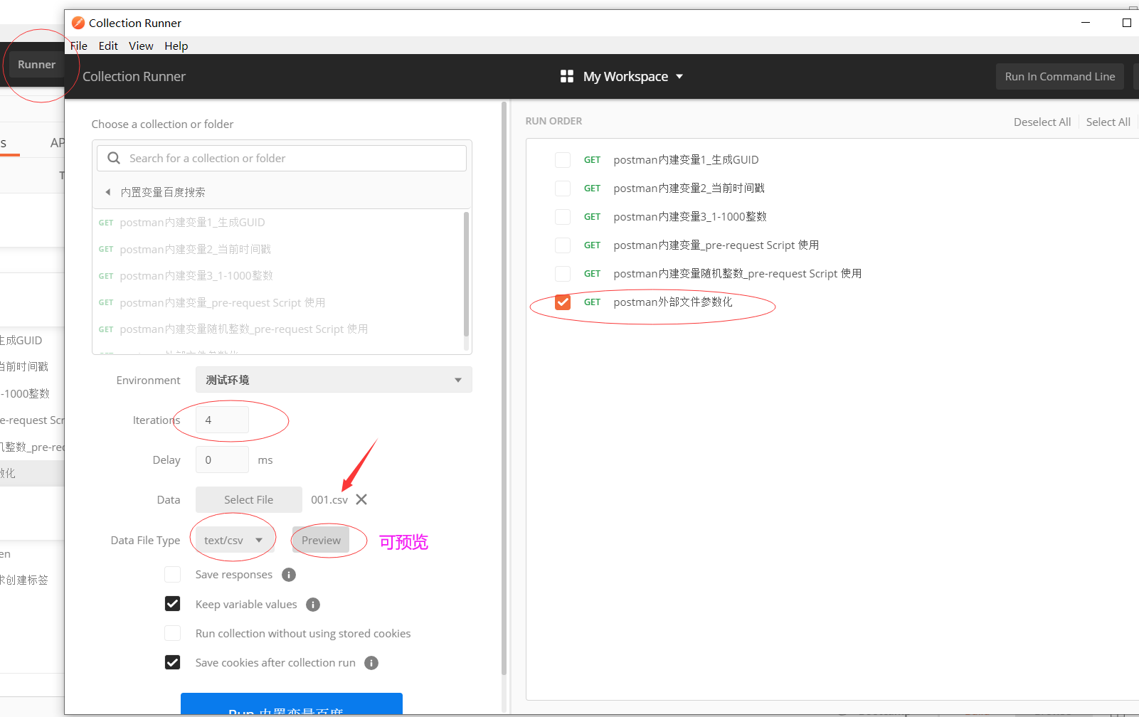 注意一定要通过runner的方式进行运行,选择对应的参数文件,输入对应的循环次数