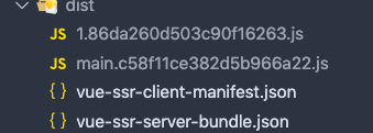 首先不考虑 entry-client.js 和 entry-server.js 做了什么(后续会补充),我们需要知道,它们经过 webpack 打包后生成了我们需要的创建 ssr 的依赖 .js 文件。 可以看下图打包出来的文件,.json 文件是用来关联 .js 文件的,就是一个辅助文件,真正起作用的还是两个 .js 文件。