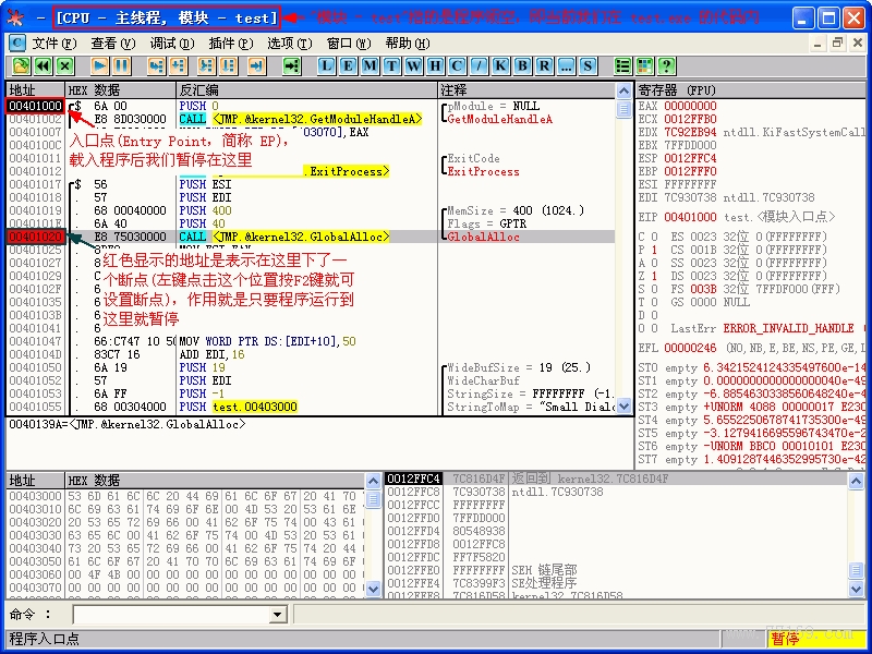 好了,我们已经得到足够的信息了。现在我们在菜单 查看->断点 上点击一下,打开断点窗口(也可以通过组合键 ALT+B 或点击工具栏上那个“B”图标打开断点窗口):