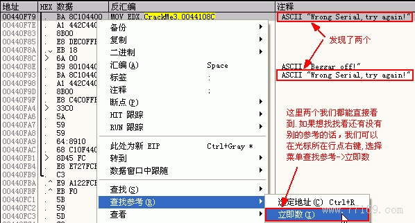 见上图,为了看看是否还有其他的参考,可以通过选择右键菜单查找参考->立即数,会出来一个对话框: