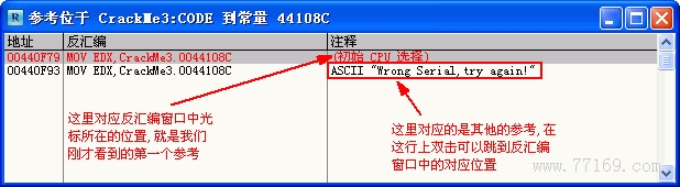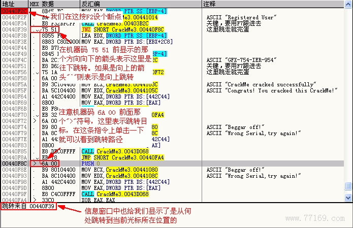 大家注意看一下,地址 00440F51 处的 CALL CrackMe3.00403B2C 和上面我们分析的地址 00440F34 处的 CALL CrackMe3.00403B2C 是不是汇编指令都一样啊?这说明检测用户名和注册码是用的同一个子程序。而这个子程序 CALL 我们在上面已经分析过了。我们执行到现在可以很容易得出结论,这个 CALL 也就是把我们输入的注册码与 00440F4C 地址处指令后的“GFX-754-IER-954”作比较,相等则 OK。