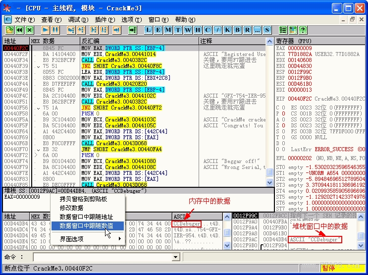 我们在上图中地址 00440F2C 处按 F2 键设个断点,现在我们按 F9 键,程序已运行起来了。我在上面那个编辑框中随便输入一下,如 CCDebuger,下面那个编辑框我还保留为原来的“754-GFX-IER-954”,我们点一下那个“Register now !”按钮,呵,OllyDBG 跳了出来,暂停在我们下的断点处。我们看一下信息窗口,你应该发现了你刚才输入的内容了吧?我这里显示是这样: