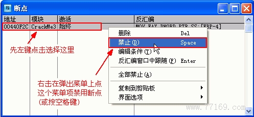 为什么要做这一步,而不是把这个断点删除呢?这里主要是为了保险一点,万一分析错误,我们还要接着分析,要是把断点删除了就要做一些重复工作了。还是先禁用一下,如果经过实际验证证明我们的分析是正确的,再删不迟。现在我们把断点禁用,在 OllyDBG 中按 F9 键让程序运行。输入我们经分析得出的内容: