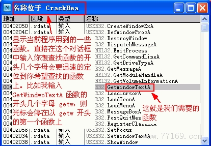 我们点一下那个“Check It”按钮试一下,哦,竟然没反应!我再输个“78787878”试试,还是没反应。再试试输入字母或其它字符,输不进去。由此判断注册码应该都是数字,只有输入正确的注册码才有动静。用 PEiD 检测一下,结果为 MASM32 / TASM32,怪不得程序比较小。信息收集的差不多了,现在关掉这个程序,我们用 OllyDBG 载入,按 F9 键直接让它运行起来,依次点击上面图中所说的菜单,使被调试程序显示如上面的第二个图。先不要点那个“Check It”按钮,保留上图的状态。现在我们没有什么字串好参考了,我们就在 API 函数上下断点,来让被调试程序中断在我们希望的地方。我们在 OllyDBG 的反汇编窗口中右击鼠标,在弹出菜单中选择 查找->当前模块中的名称 (标签),或者我们通过按 CTR+N 组合键也可以达到同样的效果(注意在进行此操作时要在 OllyDBG 中保证是在当前被调试程序的领空,我在第一篇中已经介绍了领空的概念,如我这里调试这个程序时 OllyDBG 的标题栏显示的就是“[CPU - 主线程, 模块 - CrackHea]”,这表明我们当前在被调试程序的领空)。通过上面的操作后会弹出一个对话框,如图: