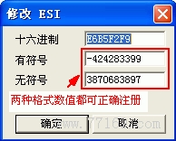 由上图我们知道了原来前面分析的对我们输入的注册码进行处理后的结果就是把字符格式转为数字格式。我们原来输入的是字串“12345666”,现在转换为了数字 12345666。这下就很清楚了,随便在上面那个修改 ESI 图中显示的有符号或无符号编辑框中复制一个,粘贴到我们调试的程序中的编辑框中试一下: