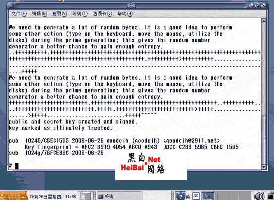 所以,一定要选择一个强壮的密码,来有效地对抗这些攻击。 密码确定以后,系统开始运算。这时需要随便地敲击键盘或是移动鼠标,以产生一些随机数,协助密钥的顺利生成。注意,如果没有以上动作,很可能最终不能产生密钥。系统运算完成后,会出现类似图4的信息: