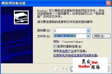 要想映射"限制盘符"驱动器,请先打开"我的电脑"窗体,选择受到禁用限制的D盘符,然后在上方单击"工具"按钮,选择映射"网络驱动器"选项,会弹出"映射网络驱动器"对话框,在内部"文件夹"标签内,输入\\本机目前处在局域网的IP地址\要映射的盘符驱动器$(如图2)。操作完毕后,单击"确定"按钮,即可在"硬盘"栏目,多出一个名为"网络硬盘驱动器Z"的虚拟盘,而且里面所含有的文件,全都是禁用D盘内的文件,在其盘符内不管做任何操作,都不会影响到D盘的原有文件以及其"限制属性"问题。