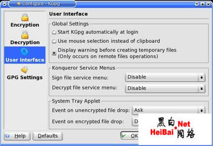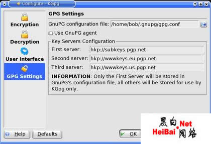 现在已经创建好密钥对了,首先就是要调试KGpg配置,点击设置配置KGpg ASCII码加密应该被选中,其他条目不用选中,在标题栏点击?按钮然后再在某个条目上点击可以获取一个弹出式的提示信息。