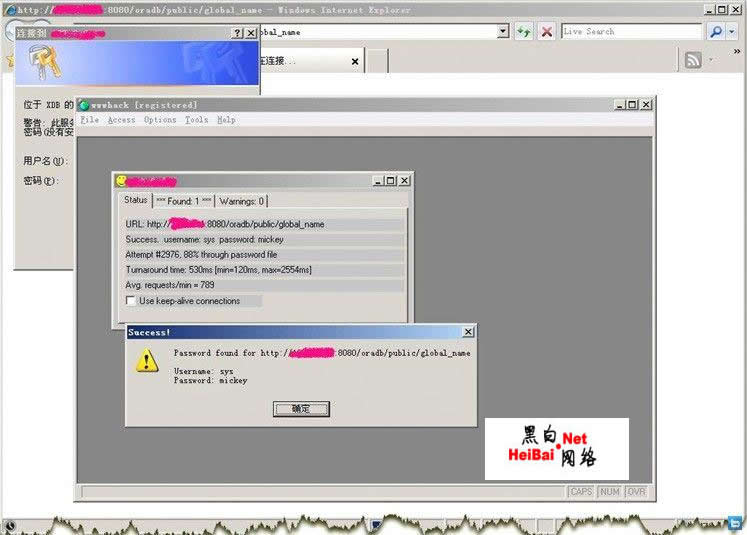 当我们访问 http://ip:8080/oradb/public/global_name 时,会弹出认证信息,这种 HTTP 的基本验证,有好 多的工具可以快速破解,可以选择著名的 Hydra,我这里选择的是图形界面的 wwwhack,设置好用户名为 SYS, 选择字典,就可以破解了。速度要比通过 Orabrute 来破解快许多。效果如图 6 所示
