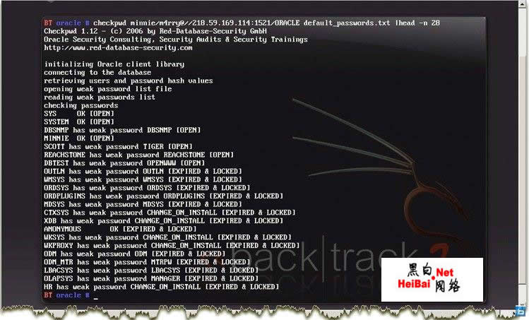 当得到一个远程登录的帐号后,可以使用 Checkpwd 来验证数据库中所有的缺省用户的默认密码。Checkpwd 是采用远程破解的,速度比较慢。不过能清晰的看出每个帐户的状态(过期,锁定),Checkpwd 的使用方法为: