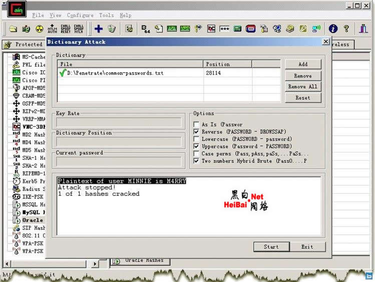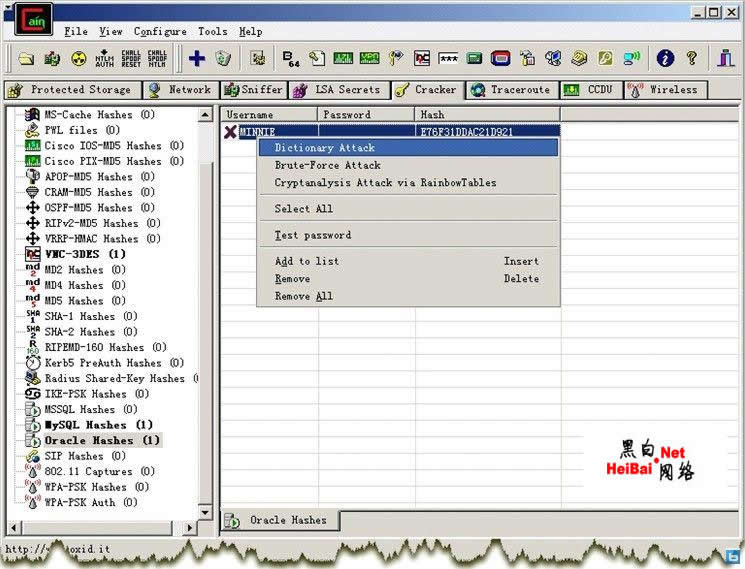本地破解速度是非常快的,我推荐先选择字典破解,在 Cain 中点选的 Cracker 标签,然后右键点击先前导入 好的用户名和哈希值,选择"Dictionary Attack"选项,就可以字典破解了。效果如图 9,图 10。