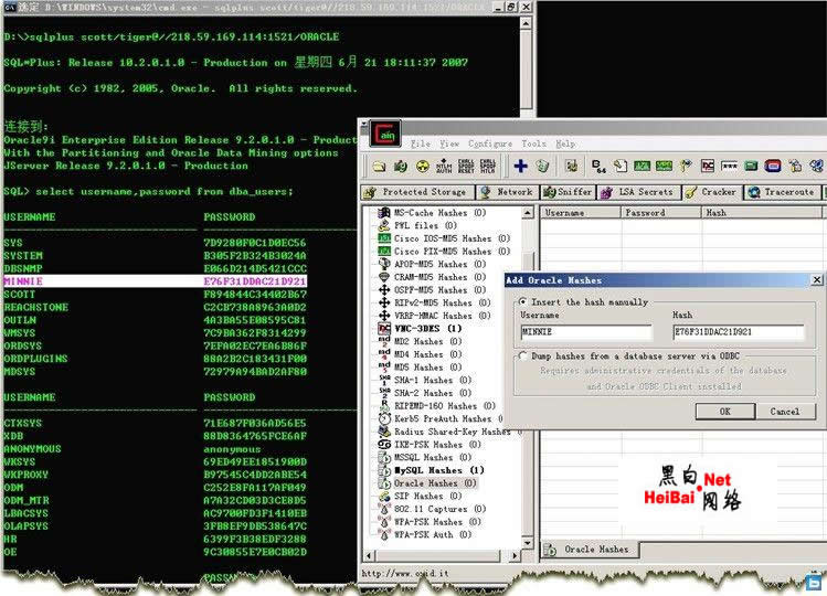 我们也可以使用 Sqlplus 直接登录到 Oracle 数据库,然后使用 select username,password form dba_users 命令查看数据库中的用户名和密码,然后本地用 Cain 来破解,如图 8 所示。