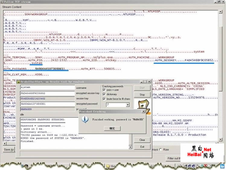 THC 组织新发布了一款叫 Orakel 的工具,该工具分析,破解 Oracle 数据库的脆弱远程认证机制。经我测试, 该工具仿佛只对 Oracle8i 的远程登录认证有效果。不过随软件附带的文档提供了一种攻击方法 。如果是在同 集线器(HUB)下的其他端口有 Oracle8i 数据库,我们知道集线器(HUB)是在同一个冲突域和广播域中的。可以 直接使用 Ethereal 此类的抓包工具抓取其他端口的用户连接 Oracle8i 数据库的认证信息。我测试的时候选择的是 Ethereal 抓包工具,因为该工具有个非常好的功能"Follow TCP Stream",可以利用这个功能,快速的找 出认证包中的 AUTH_SESSKEY,AUTH_PASSWORD,连接用户名的值 ,然后把相关的值填入 OrakelSniffert 工具中,就可以破解了,OrakelSniffert 工具支持字典破解和暴力破解,破解速度非常快。效果如图 12,图13