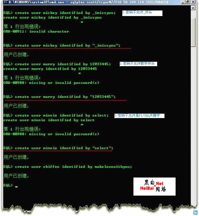 由基础知识 1 得知,默认情况下设置标准的 Oracle 密码是很不复杂的, 但可以使用双引号来突破 Oracle 的 设置密码限制,通过使用双引号能够添加以下额外的字符