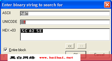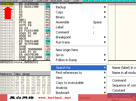 选择任何一个不确认的值,然后将表向上翻页.停在401000.我们必须去找一个CALL [xxxxx]或者一个JMP [xxxxx].右击鼠标并选择SEARCH FOR BINARY STRING