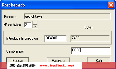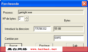 写下这个地址(红箭头).现在在PUPE中选择子进程,让它去找search (BUSCAR)这个地址值. 不同的机器这个值会不同. 我的是77E5B332.在字节窗口你会看到前两个字节是55 8B,所以在纸上写下,并在PUPE中将其改为EB FE然后按下PARCHEAR