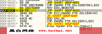 清除BPX点击run. (记住清除hardware bpx). 当程序走到我们修改为死循环的指令那儿时输入表已经修复了,再也没有坏值了. 然后它在子进程的OEP处停下.在纸上写下magic jump的值(EB 0C),记住.
