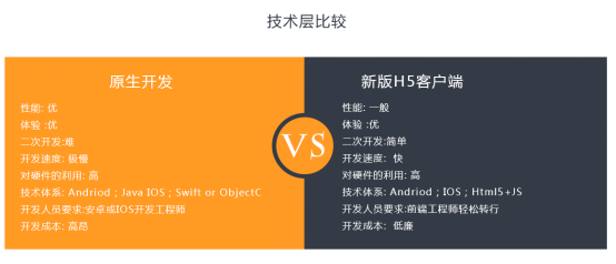 从技术层面比较,在性能上,虽然H5混合开发一般,但是相对于原生开发来说,在二次开发方面,H5混合开发二次开发简单,开发速度快,开发成本较低廉。
