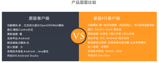 从产品层面比较,OpenSNS V2新版H5客户端采用Restful+Auth接口更安全。在更新速度上非常快,1周小升级,1月大升级。以前的客户端只支持Android,新版H5客户端将实现IOS、Android同步支持,这增加了OpenSNS在移动端方面更多的可能性。