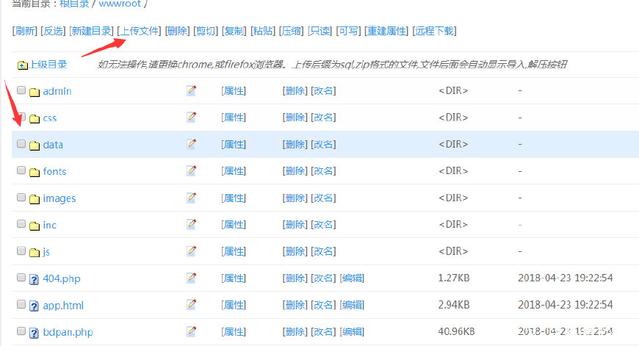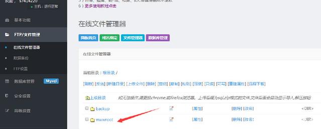 点击“文件管理器”,进入在线文件管理,接着点击“wwwroot”这个文件夹,这是网站的根目录,我们的源码要存放在这里,网站的所有文件都存放在这个文件夹里,然后是上传文件,我们就把之前打包好的以.zip后缀的安装包上传。记住,一定是.zip或者7z结尾的文件,.rar虽然也是压缩文件的一种,但是一般主机不支持这个格式的解压,一定要把源码打包成.zip后缀的压缩包,当然有些主机没有在线解压功能,就只能通过FTP上传工具单文件上传了!