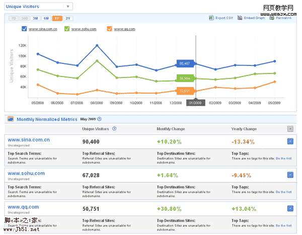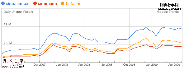 相信大家都用过Google Trends,百度也有类似的工具,但是对于Google Trends for Websites可能会有朋友并未注意到。这个工具最大的特点是能够把网站长期的流量(Daily Unique Visitors)趋势显示在一个line chart(线图)上,这样可以从一个更广的时间维度来研究一个网站。当然,如果你在搜索框内输入多个网站的名字然后用逗号隔开的话,这个工具也能够为你提供不同网站间流量的比较。如下图所示: