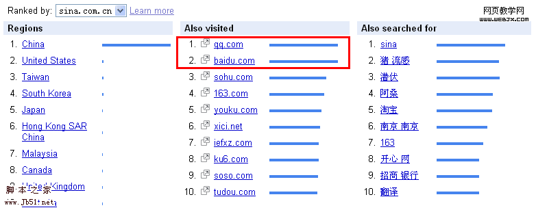 除了提供全部的流量趋势,它还能够显示出这个网站的访问者的地理位置分布,例如下图中左边的Regions数据。如果你点击China,会进一步显示具体的城市信息。而"Also visited“那一栏数据则显示了该网站的访问者还常常访问哪些其他的网站,如下图中新浪的访问者也最倾向于访问qq.com和Baidu。另外,最右边一列显示了访问新浪的访问者会最多的使用哪些关键词,不过似乎数据上有些滞后。