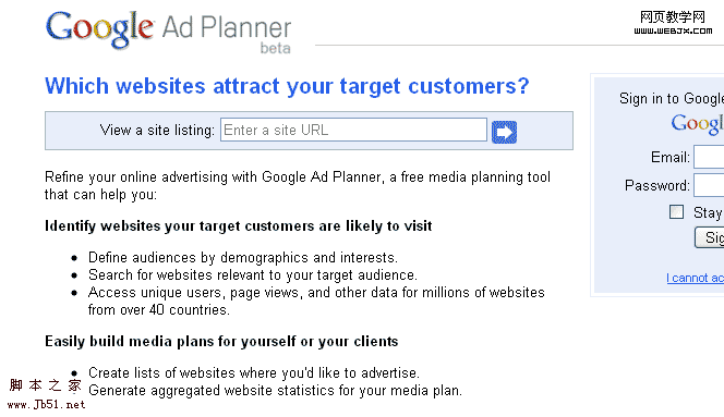 利用Google Ad Planner来研究网站流量的方法非常简单,你完全不需要用它的那些Ad Planning的工具,你需要的只是登出你的Google账号,然后进入它的首页面。如下图所示: