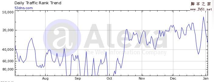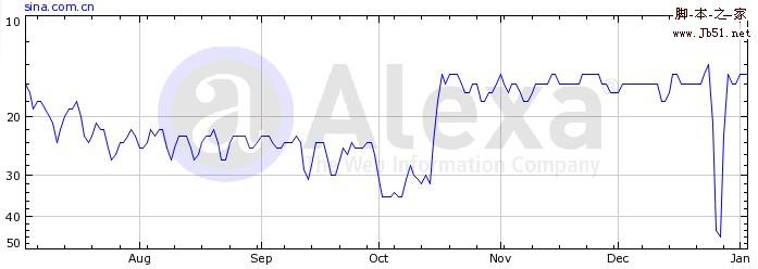 从第一张图明显看到在一年的曲线走向中是很不规则,有比较大刷排名的嫌疑,而第二张图是SINA,整体确实都是比较平缓,在10月份中旬流量出现上升趋势,在12月下旬有个大幅度的下跌趋势随后又反弹,这个现象基本上所有的中文网站都出现类似情况,可能alexa算法发生改变或者是某些因素引起所有网站产生变化,这就排除了作弊的嫌疑。只要通过曲线来判断网站是否刷排名的情 况下,我们才能去通过alexa的排名来判断网站的流量。