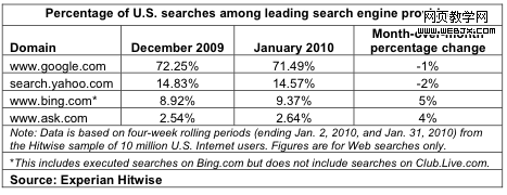 数据供应商Hitwise称,相比2009年12月份,2010年1月份Google在互联网搜索市场的占有率都有所下降,Yahoo的占有率也出现下滑,但是微软Bing的市场占有率有所提高。