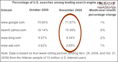 根据Hitwise的数据,1月份Google在美国互联网搜索市场的占有率从72.3%下降至71.5%;Yahoo的市场占有率从14.8%下降至14.6%。微软必应(Bing)搜索引擎的占有率从8.9%升至9.4%。IAC/Interactive Corp.旗下Ask Network的市场占有率从2.5%攀升至2.6%。