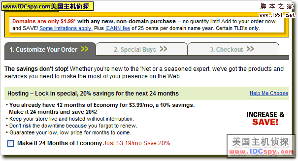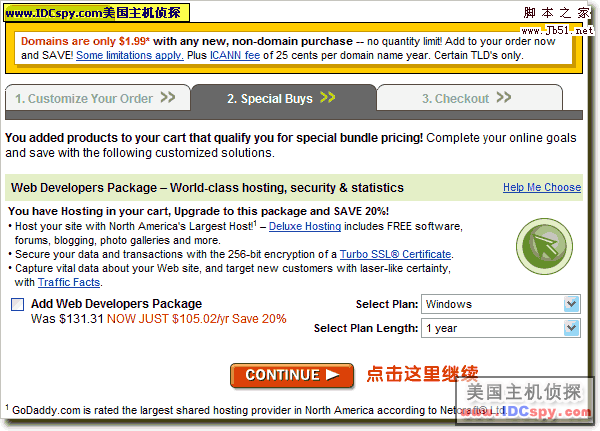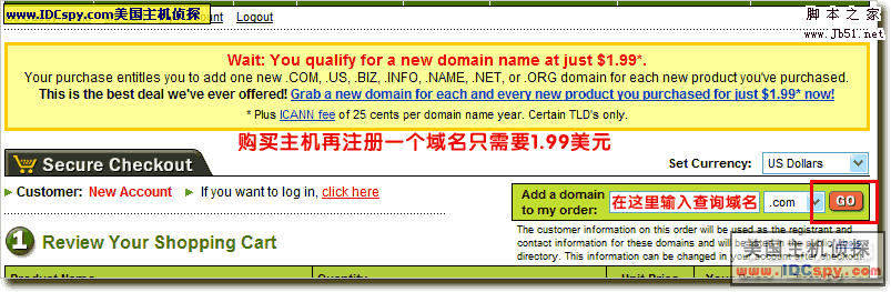 6。现在进入了购物车页面,购物车里面是你选择的主机。如果想同时注册一个1.99美元的域名,就在下图所示的位置输入你要查询的域名。如果不需要注册域名可以直接跳到第9步继续操作。