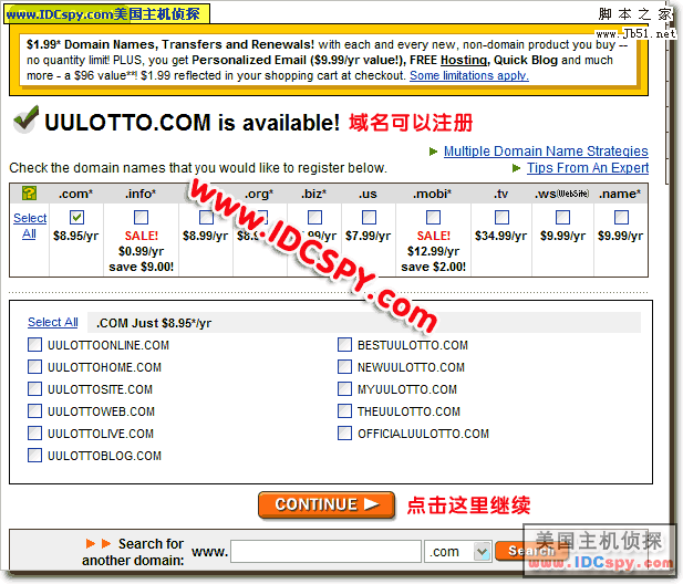 7。如果域名可以注册将出现下图所示的xxxxx.com is available,如果不可以注册,选择其他域名载进行查询。然后点击continue进入下一步。