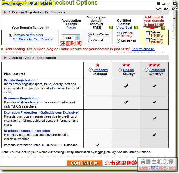 8。这一页是一些选项,可以选择域名注册时间等,选好以后点击continue进入下一页。