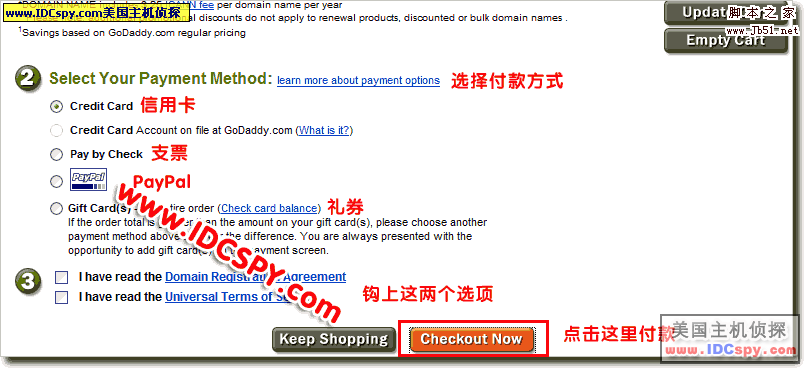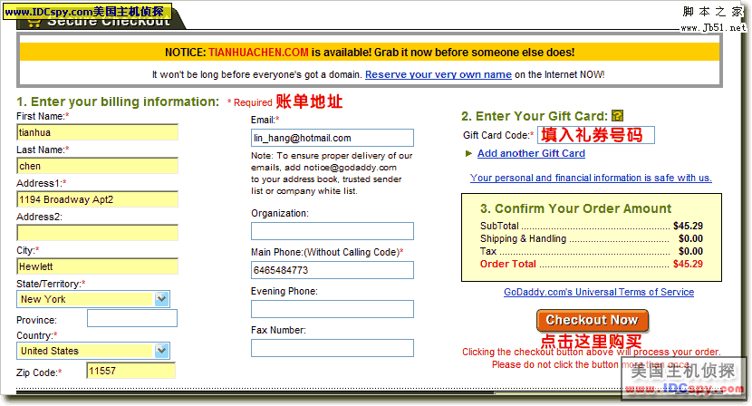 11。演示选择的是使用Gift Card付款,直接进入帐单地址填写和付款信息填写页面,如下图所示。如果是信用卡付款将进入信用卡信息及帐单地址填写,与此类似。如果选择paypal付款,首先要转入paypal网站建立与godaddy的付款协议,然后会转回godaddy的帐单填写页面,与此页面类似。需要注意的是,godaddy必须使用添加了信用卡的paypal付款。