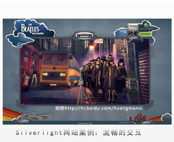 今天跟大家分享的是一个国外的披头士音乐网站(网址太长不贴了,有兴趣的朋友可以给陌野留言),这是一个充满另类风格的网站,所采用的就是微软的Silverlight,完美的界面和富交互让人不由得赞叹前端技术让网站界面如此神秀。以该网站为例,陌野觉得该网站利用Silverlight惊艳之处在于以下三点: