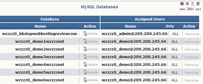 找到Mysql Databases,下面列出的就是创建的数据库,要删除数据库就单击数据库名称后面的”Delete”,点击过后,会转到另一个页面,提示你删除成功