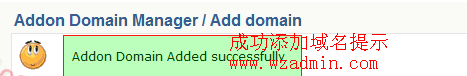 4、如果以上信息填写正确,那么恭喜你,你现在应该看到一条提示消息”Addon Domain添加了