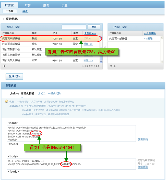 2、投放iframe代码 1)在广告管理系统中查看广告位id、宽度和高度信息,如下图所示: