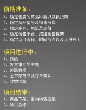 其实项目流程是贯穿始末的,以上几点在一定程度也包含在内。有的是同步进行,视情况而定。时间节点包括以上几点的确定时间,活动预热及推文的审核发布时间。主要涉及人员至少有: